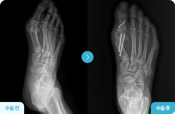 절개 없이 변형된 뼈의 축을 정확히 교정하여 통증, 흉터, 회복 기간을 획기적으로 줄였습니다.